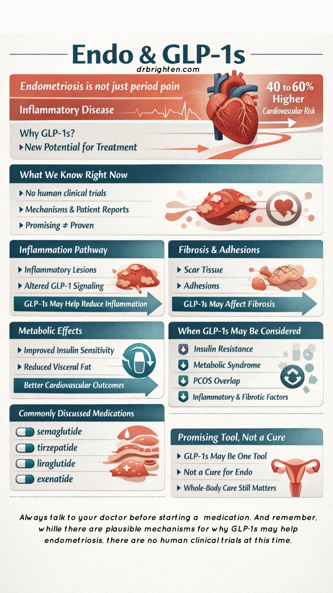Dr. Brighten: GLP one Medications may be doing something far bigger than helping people lose weight. And if you have endometriosis, what I'm about to share might completely change how you think about inflammation, fibrosis and adhesions pain, and even the long-term chronic disease risk that comes with having this disease.